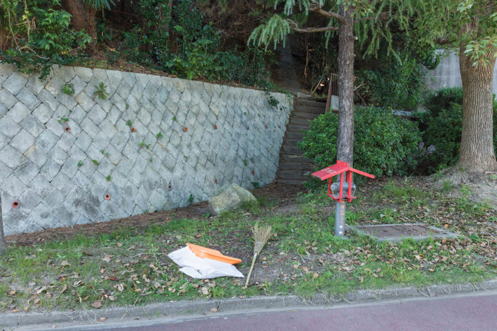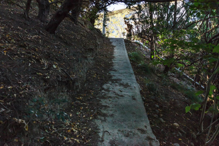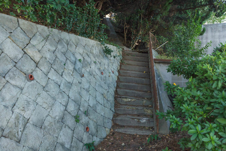 幅の狭いコンクリートの坂道を上ると頂上へ出て左奥にあります。