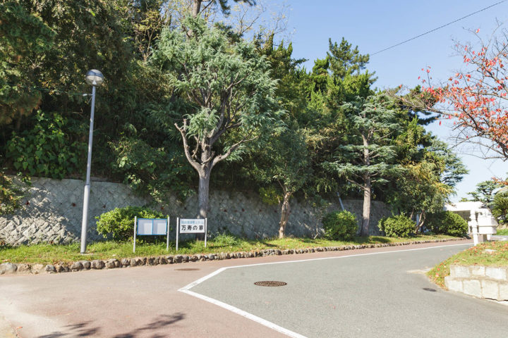 老人ホーム万寿の家の入口です。正面の石垣沿いに右方向へ進みます。