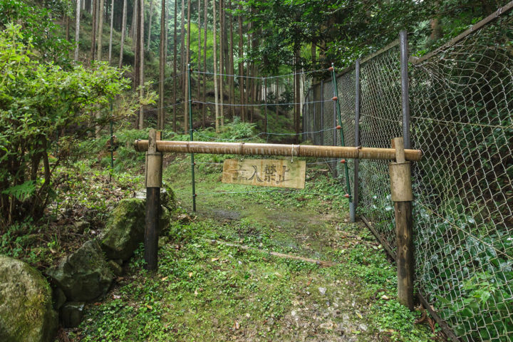 東の梶井宮墓地へ行く途中に以下のように竹のバーがありますが、その奥には鹿避けの電気柵が設置されていました。フェンス際の支柱は塩ビパイプに挿してあるだけなので抜いて奥に進むことができます。