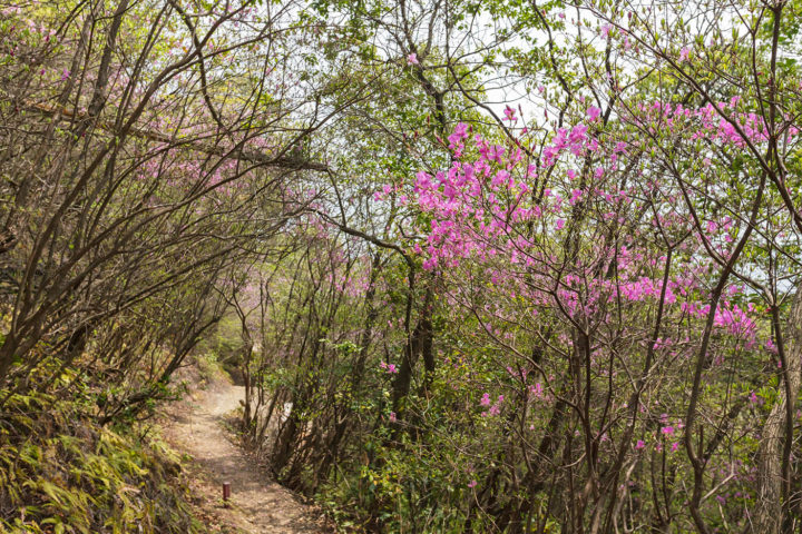 山道は危険箇所も無く歩きやすい道です。ミヤマツツジが見頃を迎えていました。
