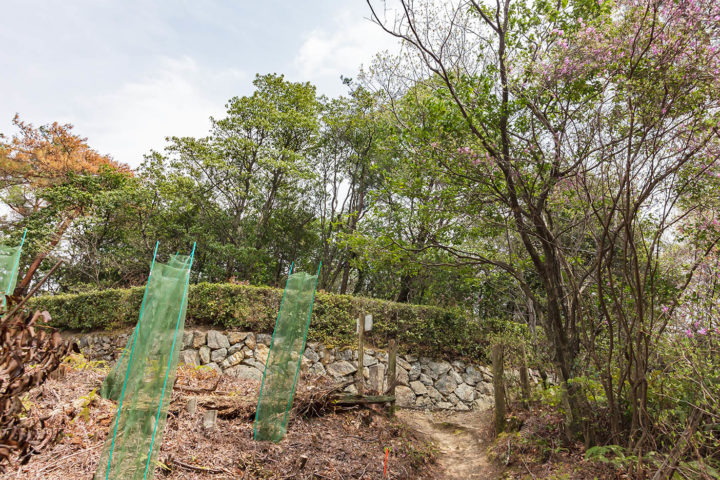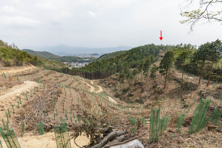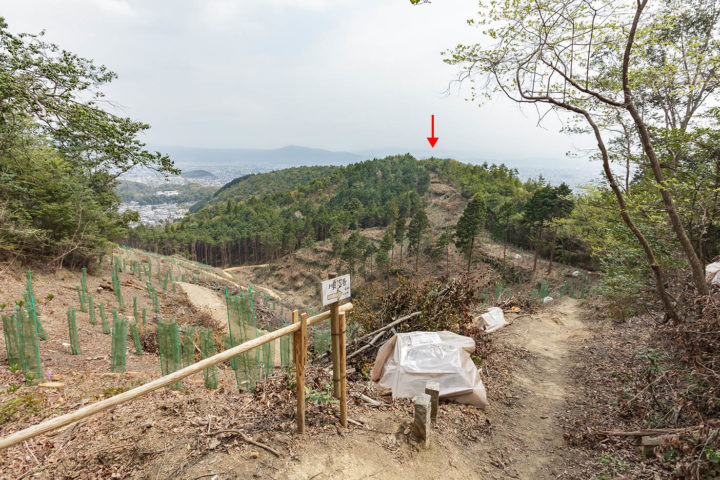中間地点を過ぎた辺りで突然視界が開けます。赤矢印が円融天皇火葬塚です。