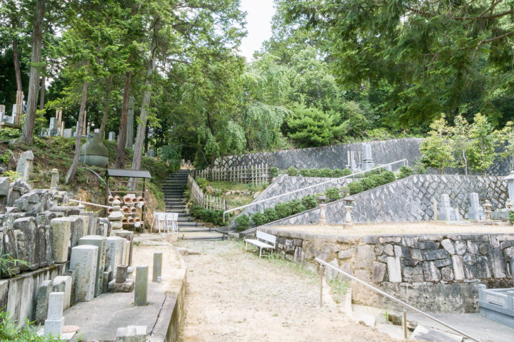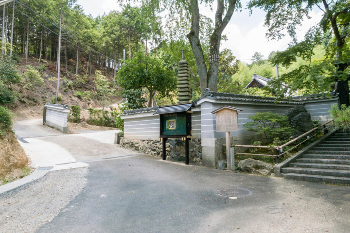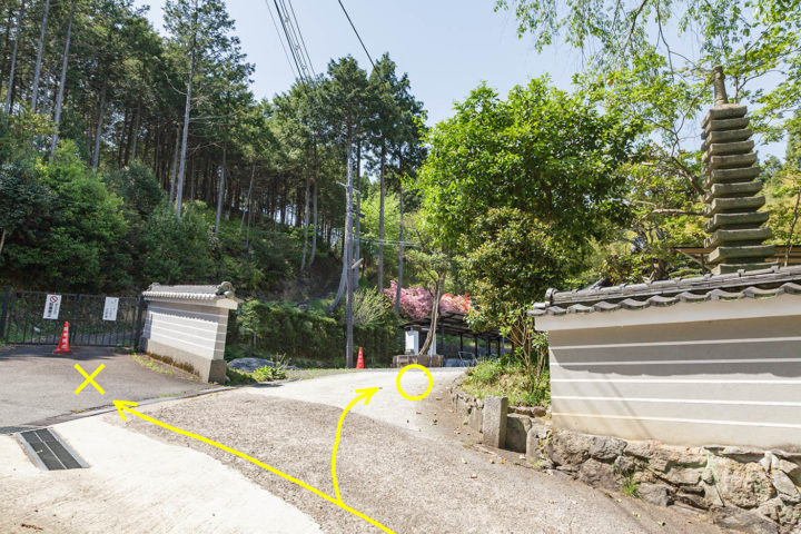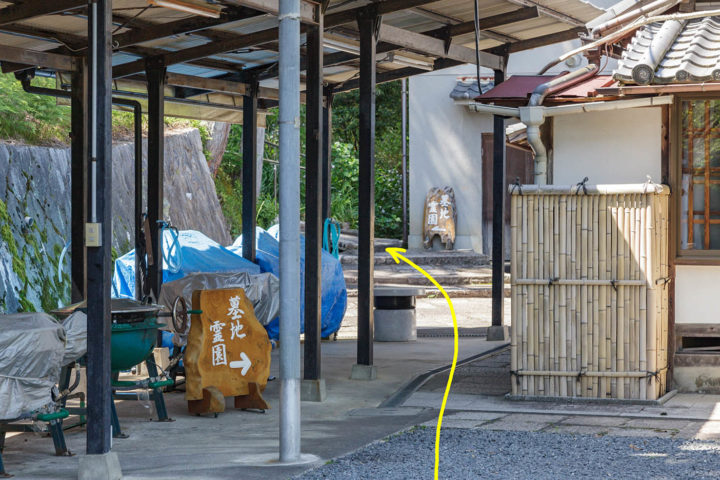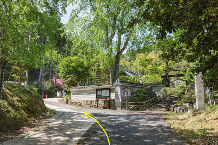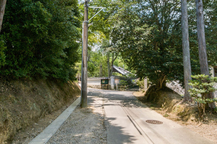 三宝寺の前まで来たら境内へは入らずに、道なりに写真左奥の坂道を上り一般墓地へ向かいます。