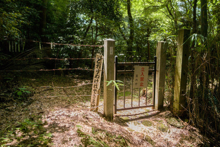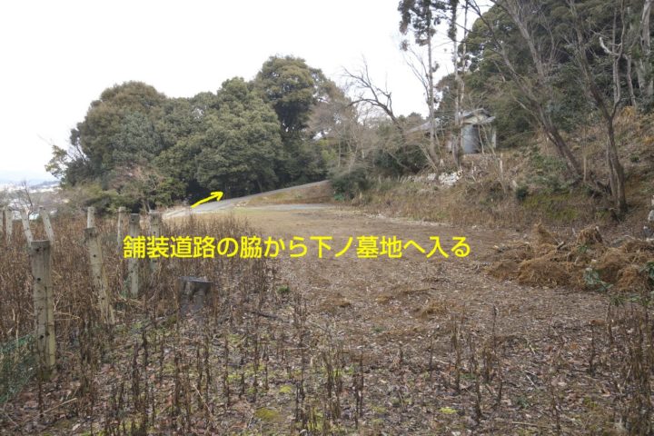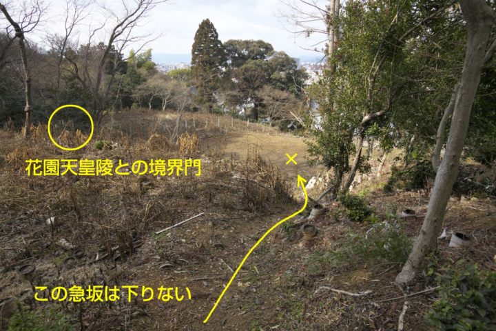 花園天皇陵との境界門から北方を眺めた景色です。前方左側の茂みの中に下ノ墓地があります。