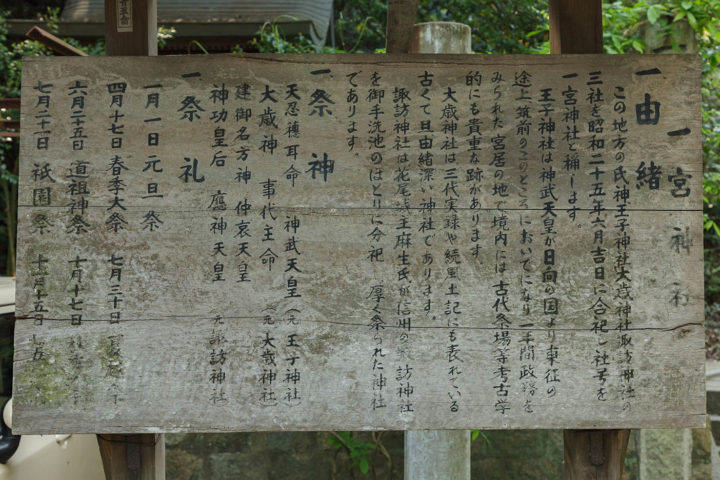 一宮神社は岡田神社の元宮で、王子神社、大歳神社、諏訪神社の三社を合祀し、このうち、王子神社が神武天皇が1年間政務をみられた宮居の地であるとされています。