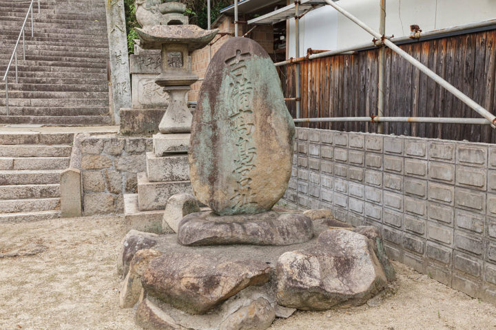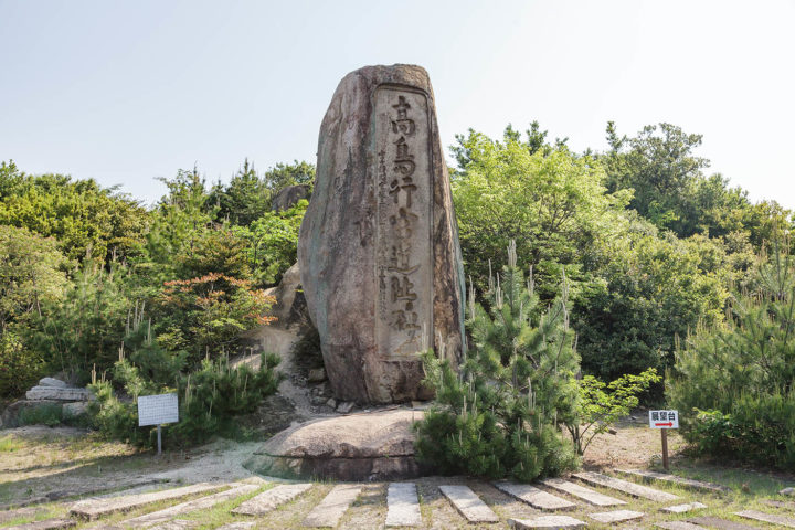 笠岡港から高島まで定期旅客船で25分かかります。港からぶらぶら写真を撮りながら歩いて20分程で神卜(かみうら)山頂上に到着します。神卜山は神武天皇が吉凶を占った場所といわれ、頂上には高島行宮遺阯碑が建っています。