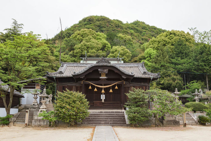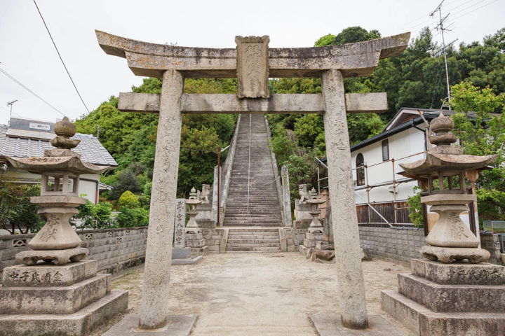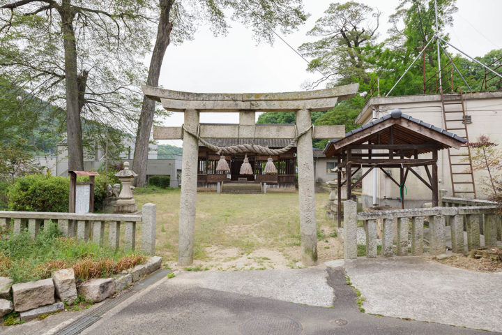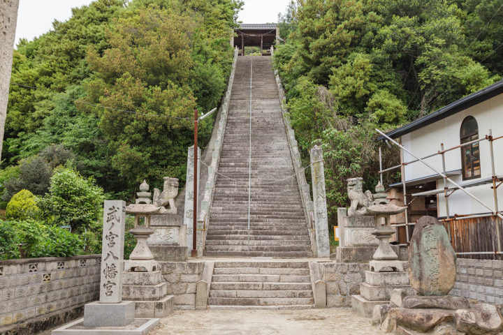 田尻町の八幡神社の鳥居右奥に吉備高島宮址碑があります。神社の駐車場は上にありますが、南の川沿いの道に路駐して鳥居から訪問した方がいいと思います。