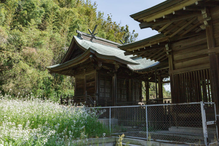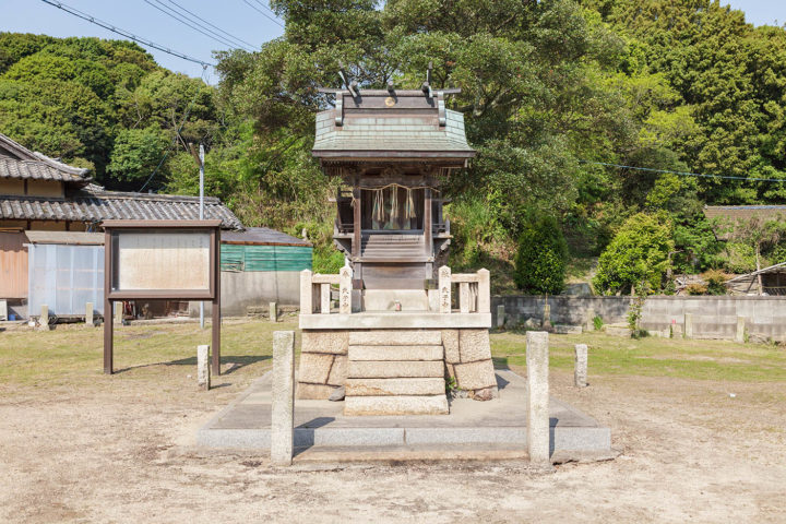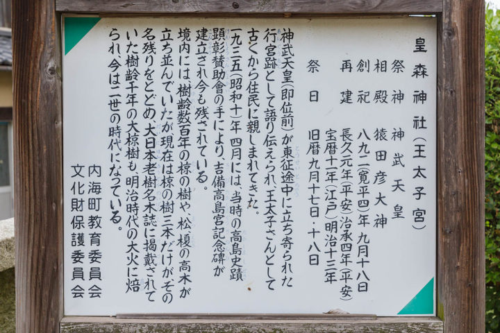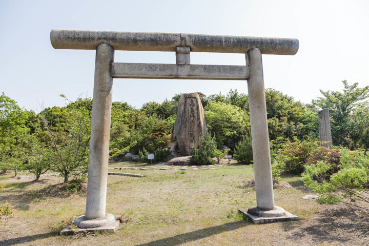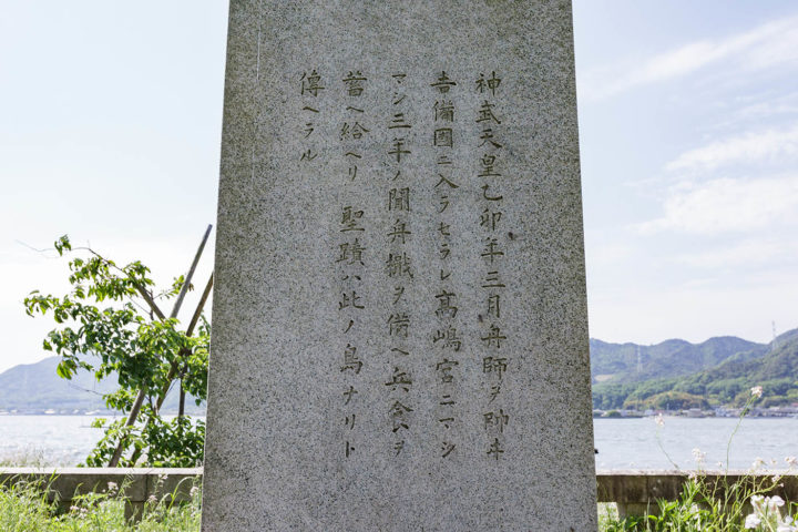 田島の皇森神社拝殿右手に吉備高島宮趾碑があります。田島へは内海大橋が架かっていて車で行くことができます。神社周辺の道は狭いので小学校の北の道路に路駐しました。