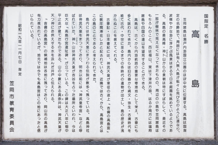 新岡山港からすぐの高島という無人島の南側にある高嶋神社が吉備高島宮伝承地であり、島には神武天皇聖蹟高嶋宮顕彰碑も建っています。高嶋神社の裏山頂上には祭祀跡の磐座(いわくら)があります。高島への行き方、磐座への登山ルートは神武天皇聖蹟高嶋宮顕彰碑のページで述べています。