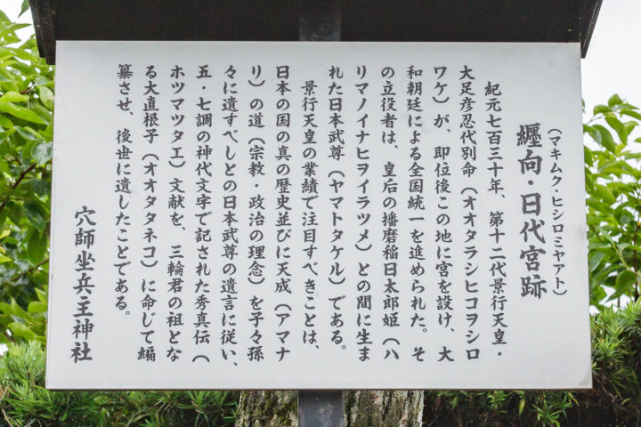宮都 纒向日代宮 2019-03-09 2019-03-16 第12代 景行天皇 まきむくのひしろのみや 奈良県桜井市穴師 JR巻向駅下車 徒歩18分 2012.6.16訪問 日代宮跡の石碑は垂仁天皇の珠城宮跡石碑から東へ10分ほど歩いた道沿いにあります。 この道から北西方向に景行天皇陵が見えます。 穴師坐兵主神社 景行天皇陵遠望 Facebook postはてブLINEPocketFeedly