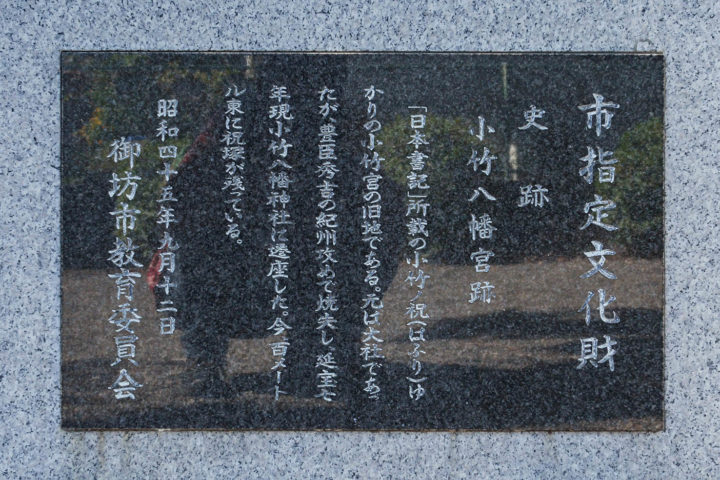 御坊市立体育館の敷地の奥に小竹八幡神社の旧地があります。説明板2枚に小竹宮のことが書かれていました。