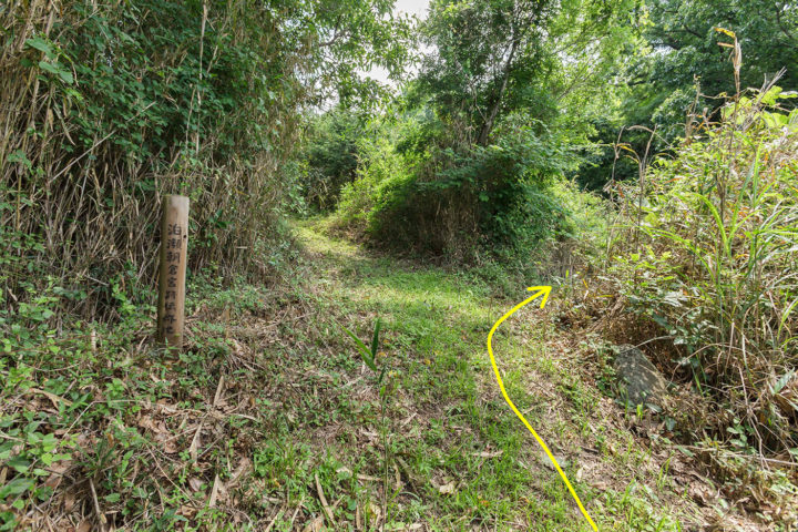 木柱の場所は分岐点になっており、写真の黄色矢印のとおり右の道を進みます。