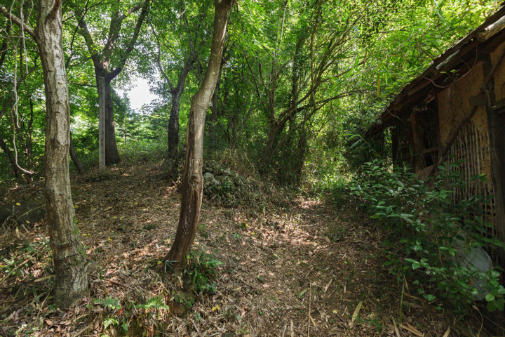 少し歩くと壊れかけた小屋が現れ、その前に字が消えている伝承地を示す木柱があります。