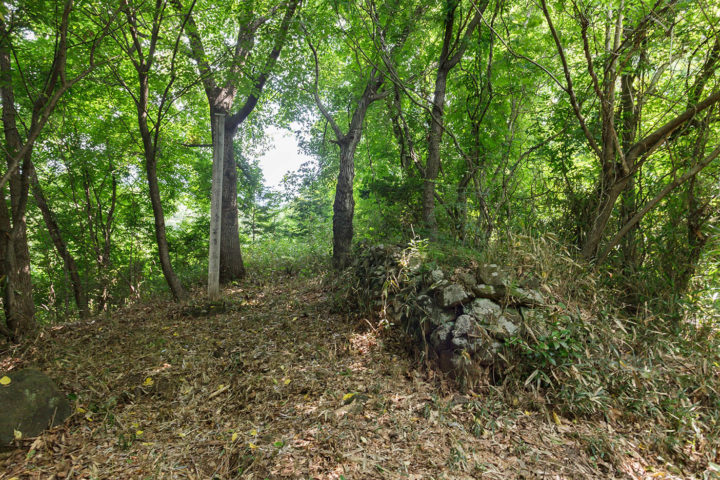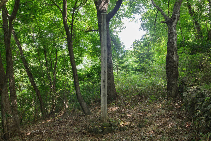 山道に入ってから20mほど歩くと山道の左手にこの木柱が現れますが、この場所が伝承地ではありません。