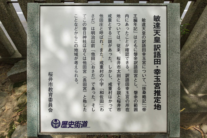 春日神社境内にある桜井市教育委員会の説明板には桜井市太田とする説も書かれており、これはJR巻向駅から西へ4分ほど歩いたところにある他田坐天照御魂神社のあたりです。(太田公民館の東隣) 以前は神社境内に敏達天皇皇居跡を示す木柱も立っていたそうですが、今回の訪問では木柱は撤去されたのか見当たりませんでした。
