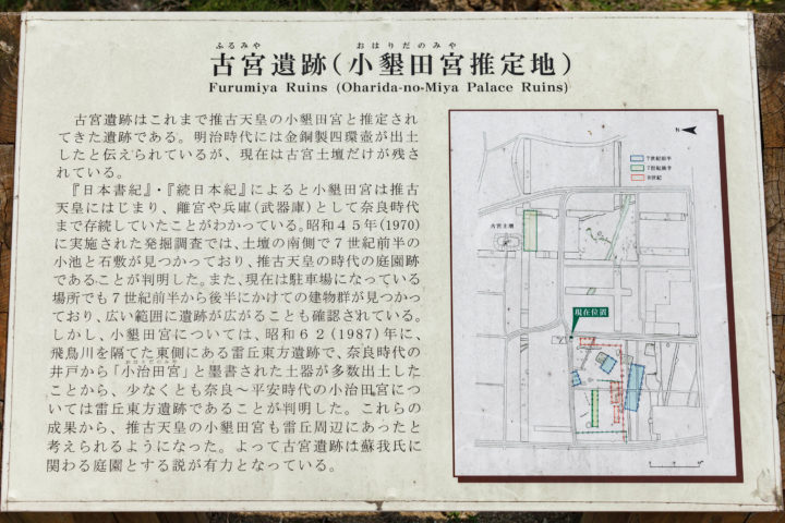 宮都 小墾田宮 2019-04-24 2019-05-07 第33代 推古天皇 おわりだのみや 奈良県高市郡明日香村雷 近鉄橿原神宮前駅又は近鉄飛鳥駅から奈良交通バスで飛鳥下車 徒歩2分 2012.5.26訪問 1987年に雷丘(いかづちのおか)東方遺跡から小治田宮(おわりだのみや)と墨書きされた土器が出土したことから、雷丘の東に小墾田宮があった可能性が高いと考えられています。また、飛鳥川より西の古宮土壇(ふるみやどだん)も小墾田宮跡の候補地になっています。 道路左の集落周辺が小墾田宮候補地 道路右の茂みが雷丘 雷丘から東方を望む 正面の集落周辺が小墾田宮候補地 古宮土壇 Facebook postはてブLINEPocketFeedly