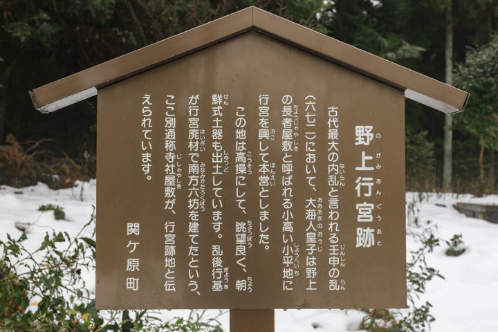 宮都 不破行宮(野上行宮) 2019-05-16 2019-05-26 第40代 天武天皇 ふわのかりみや(のがみのかりみや) 岐阜県不破郡関ケ原町野上 JR関ヶ原駅下車 徒歩36分 又は 名神高速関ヶ原ICより車で5分 桃配運動公園駐車場 駐車場から徒歩12分 2012.12.15訪問 車の場合、約700m西にある桃配運動公園の駐車場を利用されることをお勧めします。私が訪問したときは雪が積もっていて、行宮跡の石垣の一部しかわかりませんでした。 国道21号線との分岐点です。 国道21号線との分岐点付近にある標識です。まっすぐに進み墓地を通り過ぎたところにあります。 Facebook postはてブLINEPocketFeedly