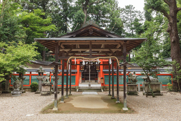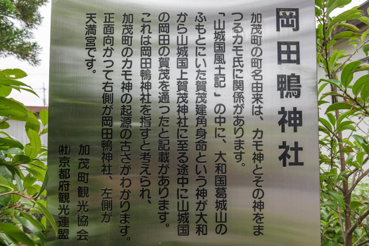 現在の岡田鴨神社の境内が岡田離宮伝承地です。岡田離宮跡地には天満宮が置かれていました。一方、岡田鴨神社は元々現在の場所から西の木津川の近くにありましたが、洪水が多く江戸時代に現在の場所に遷りました。このため現在は同一敷地内に天満宮と岡田鴨神社の2つの本殿があります。