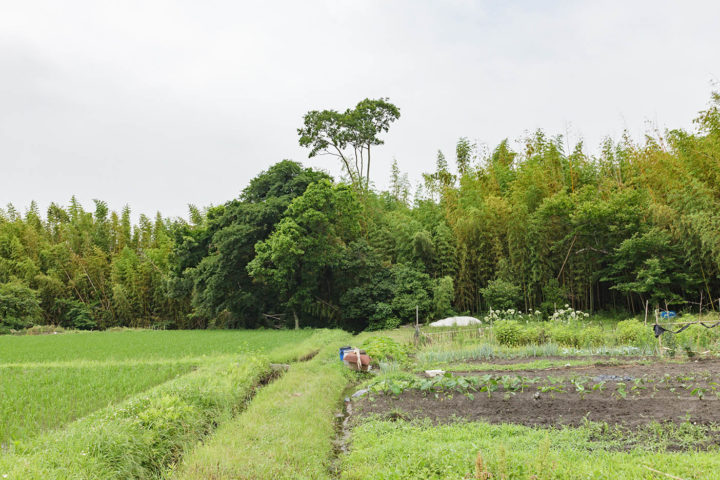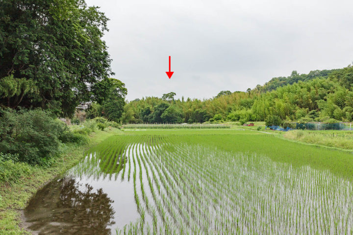 竹藪に近づくとこのように見えます。畦道の突き当たりが竹藪の入口です。