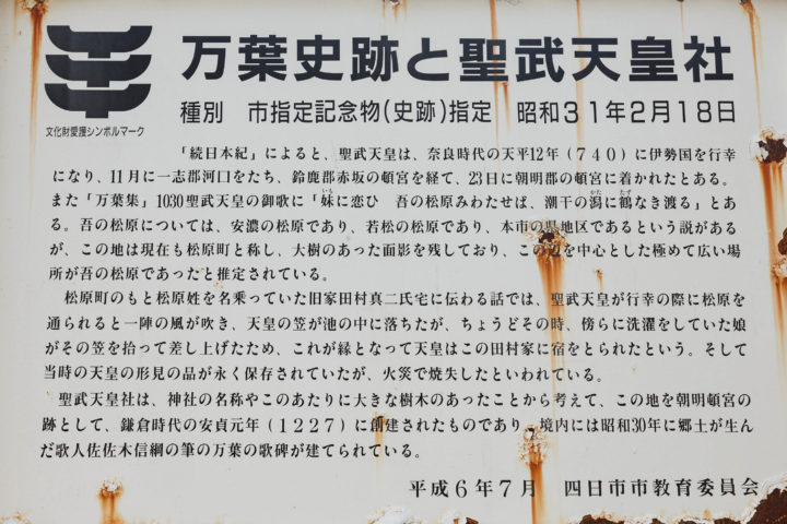宮都 朝明行宮(狭残行宮) 2019-05-30 2019-06-08 第45代 聖武天皇 あさけのかりみや(さざらのかりみや) 三重県四日市市松原町 JR富田駅下車 徒歩4分 又は 近鉄富田駅下車 徒歩11分 2014.9.6訪問 鎌倉時代に朝明行宮の跡として創建された聖武天皇社の他、奈良時代の役所跡とされる久留倍官衙遺跡も朝明行宮の候補地として注目されています。 1.聖武天皇社 2.久留倍官衙遺跡(くるべかんがいせき) Facebook postはてブLINEPocketFeedly