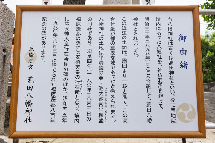 宮都 福原京 2019-06-10 2019-06-21 第81代 安徳天皇 ふくはらきょう 兵庫県神戸市兵庫区荒田町 地下鉄大倉山駅下車 徒歩8分 2012.8.12訪問 小綺麗な荒田八幡神社境内に安徳天皇行在所址と福原遷都八百年記念之碑の2つの石碑がありました。 荒田八幡神社 Facebook postはてブLINEPocketFeedly